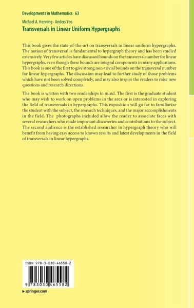 The book is written with two readerships in mind. The first is the graduate student who may wish to work on open problems in the area or is interested in exploring the field of transversals in hypergraphs. This exposition will go far to familiarize the student with the subject, the research techniques, and the major accomplishments in the field. The photographs included allow the reader to associate faces with several researchers who made important discoveries and contributions to the subject. The second audience is the established researcher in hypergraph theory who will benefit from having easy access to known results and latest developments in the field of transversals in linear hypergraphs.