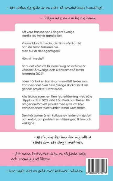 Att vara transperson i dagens Sverige kanske du tror är ganska lätt. Vi syns ibland i media, det finns vård att få och de flesta tolererar oss. Men hur är det egentligen? Hörs vi i media? Finns det vård att få inom rimlig tid och hur är den vården? Är Sverige och svenskarna så himla toleranta 2022? I den här boken har vi sammanställt texter som transpersoner över hela Sverige skickat in till oss genom projektet Transvoices. Alla åldrars scen, en liten teaterförening med säte i Uppland fick 2022 stöd från Postkodstiftelsen för att genomföra ett projekt med syfte att höja transpersoners röster under temat Allas röster. Boken är ett kollage av texter om dysfori och eufori, om problem och lösningar, fiktion och verklighet.