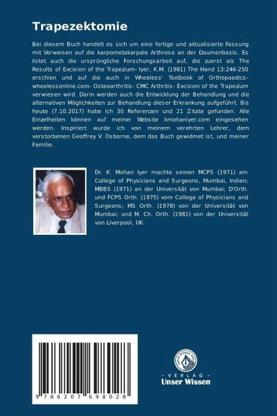 Bei diesem Buch handelt es sich um eine fertige und aktualisierte Fassung mit Verweisen auf die karpometakarpale Arthrose an der Daumenbasis. Es listet auch die ursprüngliche Forschungsarbeit auf, die zuerst als The Results of Excision of the Trapezium- Iyer, K.M. (1981) The Hand 13:246-250 erschien und auf die auch in Wheeless' Textbook of Orthopaedics- wheelessonline.com- Osteoarthritis- CMC Arthritis- Excision of the Trapezium verwiesen wird. Darin werden auch die Entwicklung der Behandlung und die alternativen Möglichkeiten zur Behandlung dieser Erkrankung aufgeführt. Bis heute (7.10.2017) habe ich 30 Referenzen und 21 Zitate gefunden. Alle Einzelheiten können auf meiner Website kmohaniyer.com eingesehen werden. Inspiriert wurde ich von meinem verehrten Lehrer, dem verstorbenen Geoffrey V. Osborne, dem das Buch gewidmet ist, und meiner Familie.