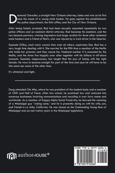 Desmond Chevalier, a straight New Orleans attorney, takes and wins as his first case the cause of a young male hooker. He goes against the establishment: the police department, the DA's office, and the City of New Orleans. After being falsely arrested, Rod had been sexually assaulted repeatedly by two police officers and an assistant district attorney. Rod becomes his assistant, and the two become partners, winning impressive and large verdicts for three other molested male hookers and a friend of Rod's, who was injured by a truck driver in the Quarter. Susande Gilfoy, much more woman than most all others, captivates Des. Rod has a very tough time dealing with it. She marries for the fifth time a member of the Mafia who holds her prisoner, and they rescue her. Husband number 5 is executed by the Mafia, and the three live happily ever after together with his billions in off-shore accounts. Susande, megawoman, has taught Rod the joys of being with the right female. He vows to become straight for part of the time and says he will have to be into same sex some of the other time. It's whimsical and light.