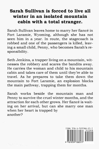 Sarah Sullivan is forced to live all winter in an isolated mountain cabin with a total stranger. Sarah Sullivan leaves home to marry her fiancé in Fort Laramie, Wyoming, although she has not seen him in a year. In route, the stagecoach is robbed and one of the passengers is killed, leaving a small child, Penny, who becomes Sarah's responsibility. Seth Jenkins, a trapper living on a mountain, witnesses the robbery and scares the bandits away. He carries the woman and child to his mountain cabin and takes care of them until they're able to travel. As he prepares to take them down the mountain to Fort Laramie, an explosion blocks the main pathway, trapping them for months. Sarah works beside the mountain man and Penny to survive the cruel winter months, and the attraction for each other grows. Her fiancé is waiting on her arrival, but can she marry one man when her heart is trapped by another?