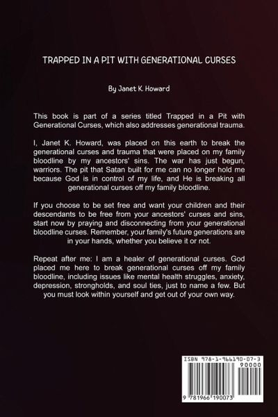 This book is part of a series titled Trapped in a Pit with Generational Curses, which also addresses generational trauma. I, Janet K. Howard, was placed on this earth to break the generational curses and trauma that were placed on my family bloodline by my ancestors' sins. The war has just begun, warriors. The pit that Satan built for me can no longer hold me because God is in control of my life, and He is breaking all generational curses off my family bloodline. If you choose to be set free and want your children and their descendants to be free from your ancestors' curses and sins, start now by praying and disconnecting from your generational bloodline curses. Remember, your family's future generations are in your hands, whether you believe it or not. Repeat after me: I am a healer of generational curses. God placed me here to break generational curses off my family bloodline, including issues like mental health struggles, anxiety, depression, strongholds, and soul ties, just to name a few. But you must look within yourself and get out of your own way.