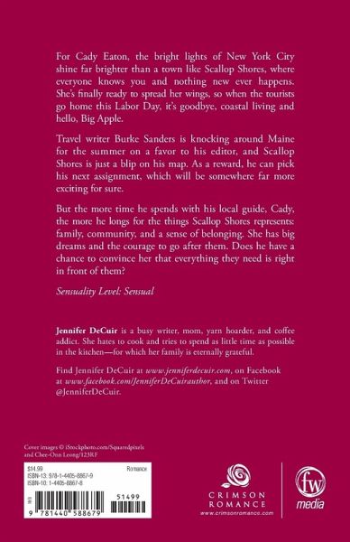 For Cady Eaton, the bright lights of New York City shine far brighter than a town like Scallop Shores, where everyone knows you and nothing new ever happens. She's finally ready to spread her wings, so when the tourists go home this Labor Day, it's goodbye, coastal living and hello, Big Apple. Travel writer Burke Sanders is knocking around Maine for the summer on a favor to his editor, and Scallop Shores is just a blip on his map. As a reward, he can pick his next assignment, which will be somewhere far more exciting for sure. But the more time he spends with his local guide, Cady, the more he longs for the things Scallop Shores represents: family, community, and a sense of belonging. She has big dreams and the courage to go after them. Does he have a chance to convince her that everything they need is right in front of them? Sensuality Level: Sensual