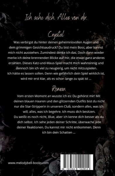 Mein Boss. Mein Stalker. Mein schlimmster Fehler?Als Stripperin zu arbeiten war nie mein Plan. Und meinem heißen Boss zu verfallen schon gar nicht. Er ist der Mann meiner Träume und Alpträume zugleich: bestimmend, verführerisch und manipulativ. Doch nach und nach begreife ich, dass er ein gefährliches Spiel spielt, aus dem es kein Entkommen gibt. Und, dass mein Einsatz dabei mehr als nur mein Körper ist. Jetzt muss ich kämpfen, um nicht auch noch mein Herz zu verlieren ...»Keine leichte Kost für zwischendurch, sondern Romantic-Thrill der Spitzenklasse.« - zane (Amazon-Rezension)Klappentext:CrystalWas verbirgst du hinter deinen geheimnisvollen Augen und dem grimmigen Gesichtsaudruck? Du bist mein Boss, aber kannst mich nicht ausstehen. Zumindest denke ich das. Doch dann wieder merke ich deine brennenden Blicke auf mir, die etwas ganz anderes erzählen. Dieses Katz-und-Maus-Spiel macht mich wahnsinnig und dennoch bin ich viel zu neugierig, um nicht mitzuspielen.Ich hätte es lassen sollen. Denn wie gefährlich dein Spiel wirklich ist, wird mir erst klar, als es schon lange zu spät ist ...RomanVom ersten Moment an wusste ich es: Du gehörst mir! Mit deinen blauen Haaren und den glitzernden Outfits bist du nicht nur die Star-Str!pperin in unserem Club, sondern alles, was ich will, alles, was ich begehre. Ich muss dich besitzen.Du weißt es noch nicht, Blue, aber ich kenne dich besser als du dich selbst. Ich sehe jeden deiner Schritte, überwache jede deiner Reaktionen. Du kannst mir nicht entkommen. Denn ich bin dein Schatten ...Zwischen Liebe und Besessenheit verläuft ein schmaler Grat. - »Trapped in Your Mind« ist der zweite düstere Band der »Blackburn Brothers«-Reihe. Es ist ein spannender, prickelnder & emotionsgeladener Romantic Thrill Liebesroman. Die Liebesgeschichte ist in sich geschlossen, komplett mit Happy End und expliziten Szenen. Für den maximalen Lesegenuss wird allerdings empfohlen, die Bücher der Reihe nach zu lesen.WARNUNG: Dieses Buch enthält Szenen, die für manche Leser verstörend sein könnten. Bitte verantwortungsvoll lesen und die Triggerwarnung beachten.Leserstimmen:»Dieser Mann ist ... ja wie soll ich es sagen? Gefährlicher, als ein schwarzes Loch! wenn er einen einmal zu sich gezogen hat, dann lässt er dich nicht mehr los und verschlingt dich komplett, ohne zu zögern und genau so war es bei mir. Und vielleicht ist mir mehr als einmal, etwas sehr heiß geworden « - Tüpfel die Weltenkatze (Buchbloggerin)»Ein Buch, das nicht nur eine spannende Story hat, sondern auch ein wichtiger Beitrag zur Entstigmatisierung psychischer Erkrankungen ist!« - Laura_liebt_lesen (Buchbloggerin)»Ein actionreicher, aber sehr düsterer zweiter Band, in dem Melody Bell facettenreiche Charaktere mit Ecken und Kanten erschaffen hat und einen Plot, der hollywoodtauglich ist. « - Ryna»Wer den ersten Teil gelesen hat und meint mehr kann es nicht werden, der irrt sich. Aber richtig. Denn Melody zeigt das sie ein noch größeres Gefühlschaos beim Lesen auslösen kann.« - Lexi LeseherzTropes:Enemies to LoversStalkerMental IllnessBesessenheit