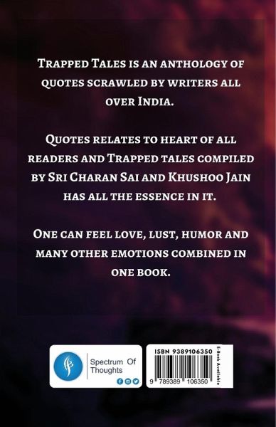 TRAPPED TALES IS AN ANTHOLOGY OF QUOTES SCRAWLED BY WRITERS ALL OVER INDIA. QUOTES RELATES TO HEART OF ALL READERS AND TRAPPED TALES COMPILED BY SRI CHARAN SAIAND KHUSHOO JAIN HAS ALL THE ESSENCE IN IT. ONE CAN FEEL LOVE, LUST, HUMOR AND MANY OTHER EMOTIONS COMBINED IN ONE BOOK.