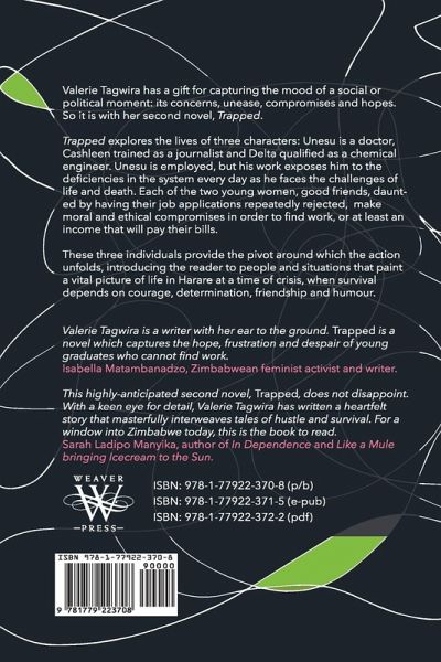 Valerie Tagwira has a gift for capturing the mood of a social or political moment: its concerns, unease, compromises and hopes. So it is with her second novel, Trapped. Trapped explores the lives of three characters: Unesu is a doctor, Cashleen trained as a journalist and Delta qualified as a chemical engineer. Unesu is employed, but his work exposes him to the deficiencies in the system every day as he faces the challenges of life and death. Each of the two young women, good friends, daunted by having their job applications repeatedly rejected, make moral and ethical compromises in order to find work, or at least an income that will pay their bills. These three individuals provide the pivot around which the action unfolds, introducing the reader to people and situations that paint a vital picture of life in Harare at a time of crisis, when survival depends on courage, determination, friendship and humour.