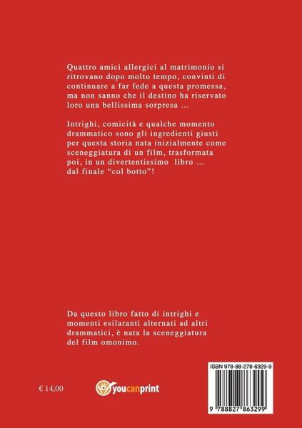 Luca, Marco, Matteo e Giovanni sono quattro inseparabili amici e compagni dal tempo del liceo. Persone dal carattere completamente diverso , hanno in comune un unico aspetto: essere single. E come la maggior parte dei giovani d'oggi, nonostante abbiano superato i trent'anni di età, non hanno alcuna intenzione di creare una famiglia. I primi tre sono dei simpatici burloni e non perdono mai l'occasione per divertirsi; il quarto molto più posato e gran lavoratore, spesso è vittima delle burle dei "vecchi" amici... ma il destino a volte gioca in nostro favore e fa riapparire la ragazza di cui Marco, in gioventù, era follemente innamorato. Quindi il terzetto decide di organizzare un incontro tra i due, ma come spesso accade, certi eventi non seguono proprio la pianificazione desiderata. Da questo libro, esaurito nella prima edizione, è stata tratta la sceneggiatura del film omonimo.