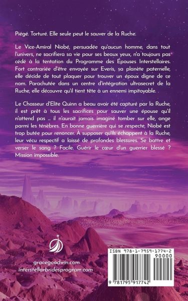 Piégé. Torturé. Elle seule peut le sauver de la Ruche. Le Vice-Amiral Niobé, persuadée qu'aucun homme, dans tout l'univers, ne sacrifiera sa vie pour ses beaux yeux, n'a toujours pas cédé à la tentation du Programme des Épouses Interstellaires. Fort contrariée d'être envoyée sur Everis, sa planète paternelle, elle décide de tout plaquer pour trouver un époux digne de ce nom. Parachutée dans un centre d'intégration ultrasecret de la Ruche, elle découvre qu'il tient tête à un ennemi impitoyable. Le Chasseur d'Elite Quinn a beau avoir été capturé par la Ruche, il est prêt à tous les sacrifices pour sauver une épouse qu'il n'attend pas ... il n'aurait jamais imaginé tomber sur elle, ange parmi les ténèbres. En bonne guerrière qui se respecte, Niobé est trop butée pour renoncer. À supposer qu'ils échappent à la Ruche, leur vécu respectif a laissé de profondes blessures. Se battre et verser le sang ? Facile. Guérir le c¿ur d'un guerrier blessé ? Mission impossible.