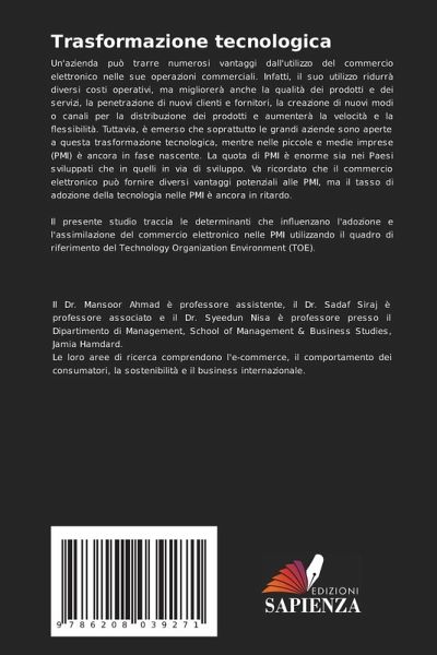 Un'azienda può trarre numerosi vantaggi dall'utilizzo del commercio elettronico nelle sue operazioni commerciali. Infatti, il suo utilizzo ridurrà diversi costi operativi, ma migliorerà anche la qualità dei prodotti e dei servizi, la penetrazione di nuovi clienti e fornitori, la creazione di nuovi modi o canali per la distribuzione dei prodotti e aumenterà la velocità e la flessibilità. Tuttavia, è emerso che soprattutto le grandi aziende sono aperte a questa trasformazione tecnologica, mentre nelle piccole e medie imprese (PMI) è ancora in fase nascente. La quota di PMI è enorme sia nei Paesi sviluppati che in quelli in via di sviluppo. Va ricordato che il commercio elettronico può fornire diversi vantaggi potenziali alle PMI, ma il tasso di adozione della tecnologia nelle PMI è ancora in ritardo.Il presente studio traccia le determinanti che influenzano l'adozione e l'assimilazione del commercio elettronico nelle PMI utilizzando il quadro di riferimento del Technology Organization Environment (TOE).