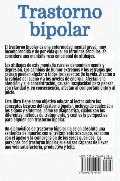 Trastorno bipolar El trastorno bipolar es algo más que cambios de humor: es una enfermedad mental profunda y a menudo incomprendida que puede convertir la vida cotidiana en una montaña rusa emocional de intensos altibajos devastadores. Para quienes la padecen, estos cambios de humor -conocidos como manía y depresión- pueden afectar drásticamente al sueño, la energía, la concentración y la toma de decisiones. Las relaciones, la carrera profesional y el bienestar general pueden verse afectados por este incesante flujo y reflujo. Pero el trastorno bipolar no tiene por qué definir su vida. En esta guía esencial, obtendrá una comprensión más profunda de lo que realmente es el trastorno bipolar, rompiendo los mitos y conceptos erróneos que lo rodean. Le guiaremos a través de los signos y síntomas, los diferentes tipos de trastorno bipolar y cómo lo diagnostican los profesionales de la salud mental. Desde los medicamentos tradicionales hasta las terapias innovadoras y los cambios en el estilo de vida, explorará las diversas opciones de tratamiento disponibles y descubrirá cómo trabajar con su equipo sanitario para encontrar el mejor plan para usted o su ser querido. Este libro ofrece un faro de esperanza, haciendo hincapié en que un diagnóstico bipolar no es el final, sino un nuevo comienzo. Con el tratamiento adecuado, estrategias de autoayuda y el apoyo inquebrantable de los seres queridos, las personas con trastorno bipolar pueden llevar vidas plenas, productivas y alegres. Aprenda consejos prácticos para controlar la enfermedad, desarrollar mecanismos de afrontamiento y crear una red de apoyo que le permita tomar las riendas de su salud mental. Tanto si le acaban de diagnosticar el trastorno bipolar, como si es un ser querido que quiere entenderlo mejor o alguien que busca formas de controlar sus síntomas de manera más eficaz, este libro es su guía completa para navegar por la vida con trastorno bipolar. Es hora de deshacerse del estigma, aceptar el conocimiento y dar el primer paso hacia un futuro más brillante y equilibrado.