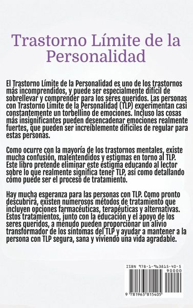 Trastorno Límite de la Personalidad El Trastorno Límite de la Personalidad (TLP) es una de las enfermedades mentales más incomprendidas y estigmatizadas, y a menudo hace que los afectados -y sus seres queridos- se sientan abrumados, confusos y aislados. Pero entender el TLP no tiene por qué ser un misterio, y vivir con él no significa vivir sin esperanza. Este libro sirve como guía compasiva a través de las complejidades del TLP, arrojando luz sobre lo que realmente significa experimentar este trastorno y ofreciendo un faro de esperanza para los afectados. En esta guía esencial, profundizará en las realidades del TLP, yendo más allá de las ideas erróneas y el estigma para descubrir lo que se siente al vivir con este trastorno. Caracterizado por una intensa agitación emocional, sensibilidad exacerbada y rápidos cambios de humor, el TLP afecta a todos los aspectos de la vida, incluidas las relaciones, el trabajo y el bienestar personal. Las ideas compartidas en este libro ayudarán a fomentar la empatía y la comprensión, proporcionando una perspectiva muy necesaria sobre cómo estos síntomas afectan a la vida cotidiana. El libro también explora las numerosas opciones de tratamiento disponibles para controlar y aliviar los síntomas del TLP. Desde soluciones farmacéuticas y terapias innovadoras hasta tratamientos alternativos, encontrará una visión completa de las vías que pueden ayudar a las personas a recuperar el control, el equilibrio y la alegría en sus vidas. El tratamiento no es único, y esta guía hace hincapié en la importancia de encontrar el enfoque adecuado que se adapte a cada individuo. Para la familia, los amigos y la pareja, este libro ofrece consejos prácticos sobre cómo ofrecer el tipo de apoyo adecuado. Aprenda estrategias para lograr una comunicación eficaz, establecer límites saludables y alimentar su relación mientras cuida a una persona con TLP. Apoyar a un ser querido con TLP puede ser un reto, pero con la orientación adecuada, puede fomentar un entorno más comprensivo y de apoyo que marque una diferencia significativa. Si usted mismo está luchando contra el TLP, apoyando a alguien que lo padece o simplemente busca comprender mejor este complejo trastorno, este libro le ofrece el conocimiento, las herramientas y la esperanza que necesita. Rompa con los conceptos erróneos, edúquese a sí mismo y a los demás, y descubra que, con la orientación adecuada, una vida estable y agradable no sólo es posible, sino que está a su alcance. Emprenda hoy mismo el viaje hacia la comprensión y la curación, y deje que este libro sea su guía para afrontar los retos que le esperan con empatía, conocimiento y esperanza.