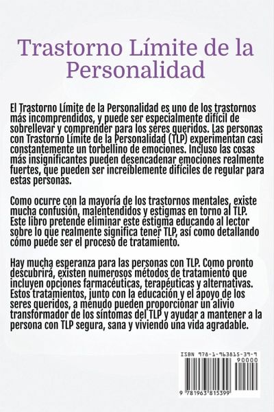 Trastorno Límite de la Personalidad El Trastorno Límite de la Personalidad (TLP) es una de las enfermedades mentales más incomprendidas y estigmatizadas, y a menudo hace que los afectados -y sus seres queridos- se sientan abrumados, confusos y aislados. Pero entender el TLP no tiene por qué ser un misterio, y vivir con él no significa vivir sin esperanza. Este libro sirve como guía compasiva a través de las complejidades del TLP, arrojando luz sobre lo que realmente significa experimentar este trastorno y ofreciendo un faro de esperanza para los afectados. En esta guía esencial, profundizará en las realidades del TLP, yendo más allá de las ideas erróneas y el estigma para descubrir lo que se siente al vivir con este trastorno. Caracterizado por una intensa agitación emocional, sensibilidad exacerbada y rápidos cambios de humor, el TLP afecta a todos los aspectos de la vida, incluidas las relaciones, el trabajo y el bienestar personal. Las ideas compartidas en este libro ayudarán a fomentar la empatía y la comprensión, proporcionando una perspectiva muy necesaria sobre cómo estos síntomas afectan a la vida cotidiana. El libro también explora las numerosas opciones de tratamiento disponibles para controlar y aliviar los síntomas del TLP. Desde soluciones farmacéuticas y terapias innovadoras hasta tratamientos alternativos, encontrará una visión completa de las vías que pueden ayudar a las personas a recuperar el control, el equilibrio y la alegría en sus vidas. El tratamiento no es único, y esta guía hace hincapié en la importancia de encontrar el enfoque adecuado que se adapte a cada individuo. Para la familia, los amigos y la pareja, este libro ofrece consejos prácticos sobre cómo ofrecer el tipo de apoyo adecuado. Aprenda estrategias para lograr una comunicación eficaz, establecer límites saludables y alimentar su relación mientras cuida a una persona con TLP. Apoyar a un ser querido con TLP puede ser un reto, pero con la orientación adecuada, puede fomentar un entorno más comprensivo y de apoyo que marque una diferencia significativa. Si usted mismo está luchando contra el TLP, apoyando a alguien que lo padece o simplemente busca comprender mejor este complejo trastorno, este libro le ofrece el conocimiento, las herramientas y la esperanza que necesita. Rompa con los conceptos erróneos, edúquese a sí mismo y a los demás, y descubra que, con la orientación adecuada, una vida estable y agradable no sólo es posible, sino que está a su alcance. Emprenda hoy mismo el viaje hacia la comprensión y la curación, y deje que este libro sea su guía para afrontar los retos que le esperan con empatía, conocimiento y esperanza.