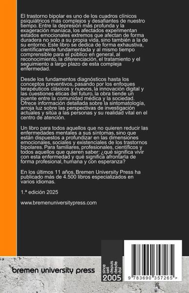 El trastorno bipolar es uno de los cuadros clínicos psiquiátricos más complejos y desafiantes de nuestro tiempo. Entre la depresión más profunda y la exageración maníaca, los afectados experimentan estados emocionales extremos que afectan de forma duradera no solo a su propia vida, sino también a la de su entorno. Este libro se dedica de forma exhaustiva, científicamente fundamentada y al mismo tiempo comprensible para el público en general, al reconocimiento, la diferenciación, el tratamiento y el seguimiento a largo plazo de esta compleja enfermedad. Desde los fundamentos diagnósticos hasta los conceptos preventivos, pasando por los enfoques terapéuticos clásicos y nuevos, la innovación digital y las cuestiones éticas del futuro, la obra tiende un puente entre la comunidad médica y la sociedad. Ofrece información detallada sobre la sintomatología, arroja luz sobre las perspectivas de investigación actuales y sitúa a las personas y su realidad vital en el centro de atención. Un libro para todos aquellos que no quieren reducir las enfermedades mentales a sus síntomas, sino que están dispuestos a profundizar en las dimensiones emocionales, sociales y existenciales de los trastornos bipolares. Para familiares, profesionales, científicos y todos aquellos que quieren saber: ¿qué significa vivir con esta enfermedad y qué significa afrontarla de forma profesional, humana y con esperanza? En los últimos 11 años, Bremen University Press ha publicado más de 4.500 libros especializados en varios idiomas. 1.ª edición 2025