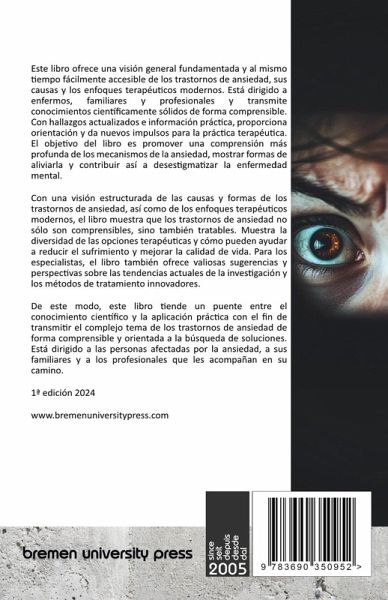 Este libro ofrece una visión general fundamentada y al mismo tiempo fácilmente accesible de los trastornos de ansiedad, sus causas y los enfoques terapéuticos modernos. Está dirigido a enfermos, familiares y profesionales y transmite conocimientos científicamente sólidos de forma comprensible. Con hallazgos actualizados e información práctica, proporciona orientación y da nuevos impulsos para la práctica terapéutica. El objetivo del libro es promover una comprensión más profunda de los mecanismos de la ansiedad, mostrar formas de aliviarla y contribuir así a desestigmatizar la enfermedad mental. Con una visión estructurada de las causas y formas de los trastornos de ansiedad, así como de los enfoques terapéuticos modernos, el libro muestra que los trastornos de ansiedad no sólo son comprensibles, sino también tratables. Muestra la diversidad de las opciones terapéuticas y cómo pueden ayudar a reducir el sufrimiento y mejorar la calidad de vida. Para los especialistas, el libro también ofrece valiosas sugerencias y perspectivas sobre las tendencias actuales de la investigación y los métodos de tratamiento innovadores. De este modo, este libro tiende un puente entre el conocimiento científico y la aplicación práctica con el fin de transmitir el complejo tema de los trastornos de ansiedad de forma comprensible y orientada a la búsqueda de soluciones. Está dirigido a las personas afectadas por la ansiedad, a sus familiares y a los profesionales que les acompañan en su camino.