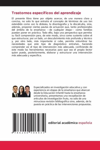El presente libro tiene por objeto acercar, de una manera clara y concisa, no solo lo que entraña el concepto de términos de uso tan extendido como son la dislexia, la disortografía y la discalculia, sino, además, proponer ciertas pautas de actuación que, tanto profesionales del ámbito de la enseñanza ¿de cualquier etapä como familias puedan poner en práctica. Todo ello, bajo una perspectiva que permita su fácil comprensión para, de este modo, sirva como sustento sobre el que estructurar, por un lado, un descubrimiento más profundo y técnico y, por otro lado, más importante si cabe, permita vislumbrar las necesidades que este tipo de diagnóstico entrañan, haciendo comprender así el tipo de intervención más adecuada, confiriendo de este modo las herramientas necesarias para que sea el propio lector quien pueda, posteriormente, elaborar y estructurar una intervención más adecuada y específica.