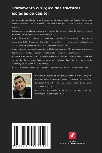 As fraturas do capítulo são raras. O tratamento cirúrgico evoluiu para fixação interna com parafusos canulados ou enterrados, permitindo a redução anatómica e a mobilização precoce.Realizamos um estudo retrospectivo unicêntrico durante um período de 6 anos, com foco no tratamento cirúrgico das fraturas do capítulo.A nossa série inclui 22 doentes com uma idade média de 42,77 anos. A proporção entre os sexos é de 0,57. O cotovelo direito foi o mais afetado (60% dos casos). Segundo a classificação de Brayn e Morrey, o tipo I foi o mais comum (45%)A osteossíntese com parafusos corticais 3,5 foi realizada em 76% dos casos. O restante das fraturas foi fixado por aparafusamento direto com parafusos cachecóis.A comparação das técnicas de osteossíntese não mostrou diferença significativa em termos de dor e mobilidade, embora os parafusos Scarf tenham apresentado complicações um pouco mais frequentes.A forma de osteossíntese não influencia os resultados funcionais, clínicos e anatómicos
