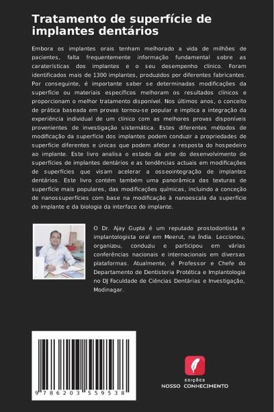 Embora os implantes orais tenham melhorado a vida de milhões de pacientes, falta frequentemente informação fundamental sobre as caraterísticas dos implantes e o seu desempenho clínico. Foram identificados mais de 1300 implantes, produzidos por diferentes fabricantes. Por conseguinte, é importante saber se determinadas modificações da superfície ou materiais específicos melhoram os resultados clínicos e proporcionam o melhor tratamento disponível. Nos últimos anos, o conceito de prática baseada em provas tornou-se popular e implica a integração da experiência individual de um clínico com as melhores provas disponíveis provenientes de investigação sistemática. Estes diferentes métodos de modificação da superfície dos implantes podem conduzir a propriedades de superfície diferentes e únicas que podem afetar a resposta do hospedeiro ao implante. Este livro analisa o estado da arte do desenvolvimento de superfícies de implantes dentários e as tendências actuais em modificações de superfícies que visam acelerar a osseointegração de implantes dentários. Este livro contém também uma panorâmica das texturas de superfície mais populares, das modificações químicas, incluindo a conceção de nanossuperfícies com base na modificação à nanoescala da superfície do implante e da biologia da interface do implante.