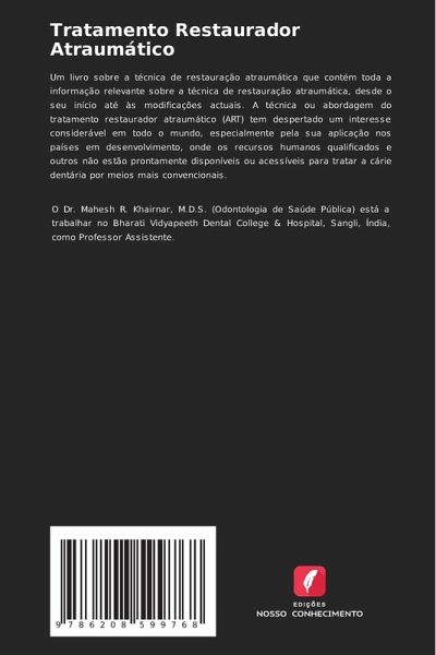 Um livro sobre a técnica de restauração atraumática que contém toda a informação relevante sobre a técnica de restauração atraumática, desde o seu início até às modificações actuais. A técnica ou abordagem do tratamento restaurador atraumático (ART) tem despertado um interesse considerável em todo o mundo, especialmente pela sua aplicação nos países em desenvolvimento, onde os recursos humanos qualificados e outros não estão prontamente disponíveis ou acessíveis para tratar a cárie dentária por meios mais convencionais.
