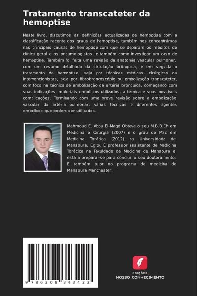 Neste livro, discutimos as definições actualizadas de hemoptise com a classificação recente dos graus de hemoptise, também nos concentrámos nas principais causas de hemoptise com que se deparam os médicos de clínica geral e os pneumologistas, e também como investigar um caso de hemoptise. Também foi feita uma revisão da anatomia vascular pulmonar, com um resumo detalhado da circulação brônquica, e em seguida o tratamento da hemoptise, seja por técnicas médicas, cirúrgicas ou intervencionistas, seja por fibrobroncoscópio ou embolização transcateter, com foco na técnica de embolização da artéria brônquica, começando com suas indicações, materiais embólicos utilizados, a técnica e suas possíveis complicações. Terminando com uma breve revisão sobre a embolização vascular da artéria pulmonar, várias técnicas e diferentes agentes embólicos que podem ser utilizados.