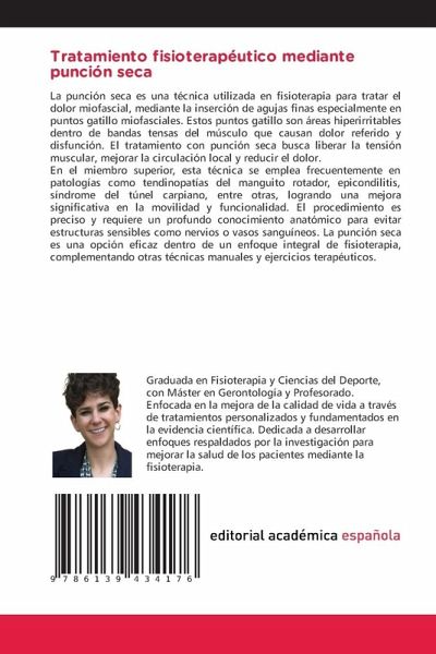 La punción seca es una técnica utilizada en fisioterapia para tratar el dolor miofascial, mediante la inserción de agujas finas especialmente en puntos gatillo miofasciales. Estos puntos gatillo son áreas hiperirritables dentro de bandas tensas del músculo que causan dolor referido y disfunción. El tratamiento con punción seca busca liberar la tensión muscular, mejorar la circulación local y reducir el dolor.En el miembro superior, esta técnica se emplea frecuentemente en patologías como tendinopatías del manguito rotador, epicondilitis, síndrome del túnel carpiano, entre otras, logrando una mejora significativa en la movilidad y funcionalidad. El procedimiento es preciso y requiere un profundo conocimiento anatómico para evitar estructuras sensibles como nervios o vasos sanguíneos. La punción seca es una opción eficaz dentro de un enfoque integral de fisioterapia, complementando otras técnicas manuales y ejercicios terapéuticos.