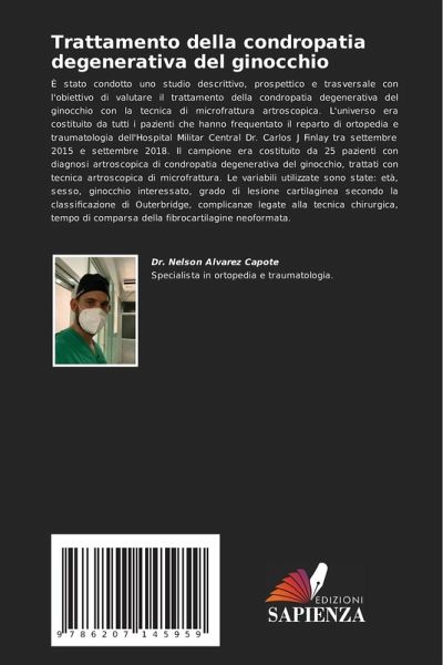 È stato condotto uno studio descrittivo, prospettico e trasversale con l'obiettivo di valutare il trattamento della condropatia degenerativa del ginocchio con la tecnica di microfrattura artroscopica. L'universo era costituito da tutti i pazienti che hanno frequentato il reparto di ortopedia e traumatologia dell'Hospital Militar Central Dr. Carlos J Finlay tra settembre 2015 e settembre 2018. Il campione era costituito da 25 pazienti con diagnosi artroscopica di condropatia degenerativa del ginocchio, trattati con tecnica artroscopica di microfrattura. Le variabili utilizzate sono state: età, sesso, ginocchio interessato, grado di lesione cartilaginea secondo la classificazione di Outerbridge, complicanze legate alla tecnica chirurgica, tempo di comparsa della fibrocartilagine neoformata.