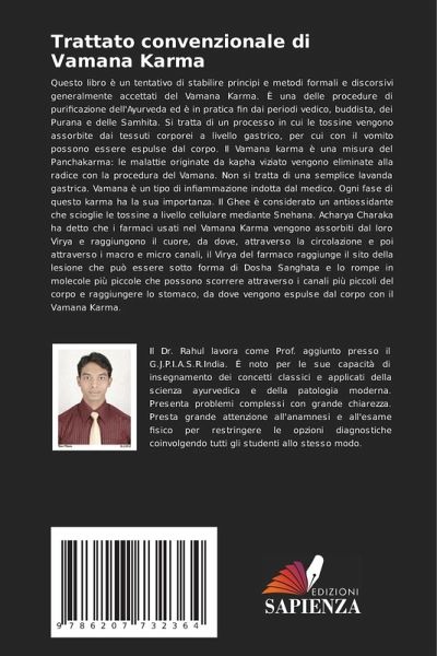 Questo libro è un tentativo di stabilire principi e metodi formali e discorsivi generalmente accettati del Vamana Karma. È una delle procedure di purificazione dell'Ayurveda ed è in pratica fin dai periodi vedico, buddista, dei Purana e delle Samhita. Si tratta di un processo in cui le tossine vengono assorbite dai tessuti corporei a livello gastrico, per cui con il vomito possono essere espulse dal corpo. Il Vamana karma è una misura del Panchakarma: le malattie originate da kapha viziato vengono eliminate alla radice con la procedura del Vamana. Non si tratta di una semplice lavanda gastrica. Vamana è un tipo di infiammazione indotta dal medico. Ogni fase di questo karma ha la sua importanza. Il Ghee è considerato un antiossidante che scioglie le tossine a livello cellulare mediante Snehana. Acharya Charaka ha detto che i farmaci usati nel Vamana Karma vengono assorbiti dal loro Virya e raggiungono il cuore, da dove, attraverso la circolazione e poi attraverso i macro e micro canali, il Virya del farmaco raggiunge il sito della lesione che può essere sotto forma di Dosha Sanghata e lo rompe in molecole più piccole che possono scorrere attraverso i canali più piccoli del corpo e raggiungere lo stomaco, da dove vengono espulse dal corpo con il Vamana Karma.