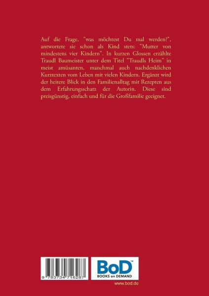 Auf die Frage, "was möchtest Du mal werden?", antwortete sie schon als Kind stets: "Mutter von mindestens vier Kindern". In kurzen Glossen erzählte Traudl Baumeister unter dem Titel "Traudls Heim" in meist amüsanten, manchmal auch nachdenklichen Kurztexten vom Leben mit vielen Kindern. Ergänzt wird der heitere Blick in den Familienalltag mit Rezepten aus dem Erfahrungsschatz der Autorin. Diese sind preisgünstig, einfach und für die Großfamilie geeignet.