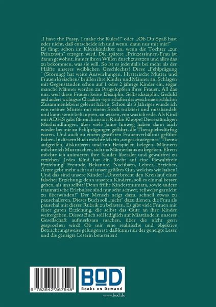 "I have the Pussy, I make the Rules!!" oder "Ob Du Spaß hast oder nicht, daß entscheide ich und wenn, dann nur mit mir!" Es fängt schon im Kleinkindalter an, wenn die Tochter "zur Prinzessin" erzogen wird. Die spätere "Prinzessinnen-Frau ist daran gewöhnt, immer ihren Willen durchzusetzen und alles das zu bekommen, was sie will. So ist es jedenfalls bei mehr als der Hälfte unseres weiblichen Geschlechts! Diese "Fehlprägung" (Störung) hat weite Auswirkungen. Hysterische Mütter und Frauen kreischen/ brüllen ihre Kinder und Männer an. Schlagen mit Gegenständen schon auf 1 oder 2 jährige Kinder ein, sogar manche Männer werden zu Prügelopfern ihrer Frauen. All das nur, weil diese Frauen keine Disziplin, Selbstdisziplin, Geduld und andere wichtigste Charaktereigenschaften des zwischenmenschlichen Zusammenlebens gelernt haben. Schon als 3 Jähriger wurde ich von meiner Mutter mit einem Stock traktiert und misshandelt und kann somit behaupten, zu wissen, von was ich rede. Als Kind mit ADHS gabs für mich anstatt Ritalin Kloppe! Diese ständigen Misshandlungen, über viele Jahre hinweg haben dann auch wieder bei mir zu Fehlprägungen geführt, die therapiebedürftig waren. Und auch zu einem gestörten Frauenverhältnis geführt haben. In diesem Buch möchte ich ein "totgeschwiegenes" Thema aufgreifen, diskutieren und mit Beispielen belegen. Männern möchte ich Mut machen, sich ins Männerhaus zu begeben. Eltern möchte ich animieren, ihre Kinder liberaler und gewaltfrei zu erziehen! Jedes Kind hat ein Recht auf eine gewaltfreie Erziehung! Freunde, Bekannte, Nachbarn, Lehrer, Erzieher, Ärzte gebt mehr acht auf unser größtes Gut, welches wir haben! Und das sind unsere Kinder! "Unterbrecht den Kreislauf einer falscher Erziehung; denn unseren Kindern, soll es einmal besser gehen, als uns selbst! Denn frühe Kindestraumata, sowie andere traumatische Erlebnisse sind nur sehr schwer, teilweise gar nicht zu überwinden!" Der Mensch neigt dazu, schnell etwas zu pauschalieren. Dieses Buch soll "nicht" dazu dienen, die Frau als pauschal mit dieser Rubrik zu belasten. Es gibt viele Frauen mit einer guten Erziehung, die selbst das Gute an ihre Kinder weitergeben. Dieses Buch soll lediglich auf Misstände in unserer Gesellschaft aufmerksam machen, über die nicht gern gesprochen wird! Ob mir eine realitische und objektive Betrachtungsweise gelungen ist, daß kann nur der geneigte Leser und die geneigte Leserin beurteilen!