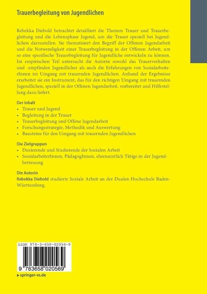 Rebekka Diebold betrachtet die Themen Trauer und Trauerbegleitung und die Lebensphase Jugend detailliert, um ausgehend davon zu verstehen, wie sich Trauer speziell bei Jugendlichen darstellt. Sie thematisiert den Begriff der Offenen Jugendarbeit und die Notwendigkeit einer Trauerbegleitung in der Offenen Arbeit, um so eine spezifische Trauerbegleitung für Jugendliche entwickeln zu können. Im empirischen Teil der Arbeit untersucht die Autorin sowohl das Trauerverhalten und -empfinden einiger Jugendlicher als auch die Erfahrungen von Sozialarbeitern im Umgang mit trauernden Jugendlichen. Aus den gewonnenen Ergebnissen erarbeitet sie ein Instrument, das für den richtigen Umgang mit trauernden Jugendlichen, speziell in der Offenen Jugendarbeit, vorbereitet und Hilfestellung dazu liefert.