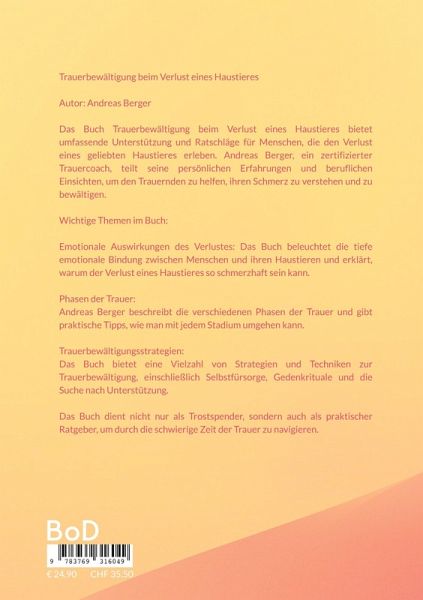 Trauerbewältigung beim Verlust eines Haustieres Autor: Andreas Berger Das Buch Trauerbewältigung beim Verlust eines Haustieres bietet umfassende Unterstützung und Ratschläge für Menschen, die den Verlust eines geliebten Haustieres erleben. Andreas Berger, ein zertifizierter Trauercoach, teilt seine persönlichen Erfahrungen und beruflichen Einsichten, um den Trauernden zu helfen, ihren Schmerz zu verstehen und zu bewältigen. Wichtige Themen im Buch: Emotionale Auswirkungen des Verlustes: Das Buch beleuchtet die tiefe emotionale Bindung zwischen Menschen und ihren Haustieren und erklärt, warum der Verlust eines Haustieres so schmerzhaft sein kann. Phasen der Trauer: Andreas Berger beschreibt die verschiedenen Phasen der Trauer und gibt praktische Tipps, wie man mit jedem Stadium umgehen kann. Trauerbewältigungsstrategien: Das Buch bietet eine Vielzahl von Strategien und Techniken zur Trauerbewältigung, einschließlich Selbstfürsorge, Gedenkrituale und die Suche nach Unterstützung. Tierkommunikation: Ein besonderes Kapitel widmet sich der Tierkommunikation, in dem Andreas Frau, eine Energetikerin, ihre Erfahrungen und Erkenntnisse teilt. Ressourcen und Unterstützung: Das Buch enthält Informationen über verfügbare Ressourcen, wie Tierschutzorganisationen, Tierfriedhöfe und Online-Communitys, die zusätzliche Unterstützung bieten. Mit seiner klaren, einfühlsamen und praxisorientierten Herangehensweise bietet Andreas Berger einen wertvollen Leitfaden für alle, die den Verlust eines Haustieres bewältigen müssen. Das Buch dient nicht nur als Trostspender, sondern auch als praktischer Ratgeber, um durch die schwierige Zeit der Trauer zu navigieren.