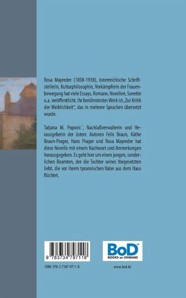 Rosa Mayreder (1858-1938), österreichische Schriftstellerin, Kulturphilosophin, Vorkämpferin der Frauenbewegung hat viele Essays, Romane, Novellen, Sonette u.a. veröffentlicht. Ihr berühmtestes Werk ist "Zur Kritik der Weiblichkeit", das in mehrere Sprachen übersetzt wurde. Tatjana M. Popovic´ , Nachlaßverwalterin und Herausgeberin der österr. Autoren Felix Braun, Käthe Braun-Prager, Hans Prager und Rosa Mayreder hat diese Novelle mit einem Nachwort und Anmerkungen herausgegeben. Es geht hier um einen jungen, sonderlichen Beamten, der die Tochter seines Vorgesetzten liebt, die vor ihrem tyrannischen Vater aus dem Haus flüchtet.
