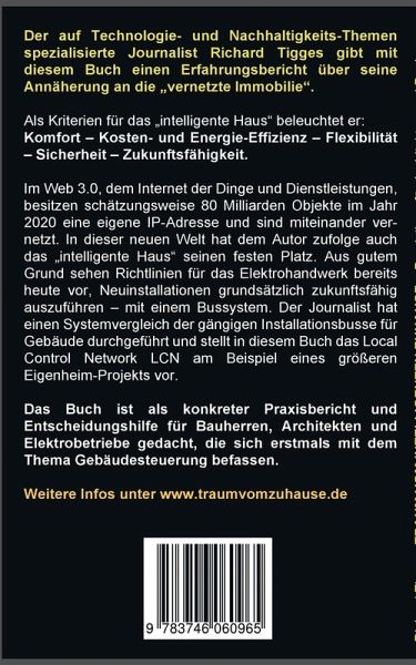 Wer ein Haus baut oder modernisiert, sollte die Chance nutzen, es mit Intelligenz auszustatten. Der Autor beschreibt in Band 1 seine eigene Annäherung an die vernetzte Immobilie. Als Kriterien für das "intelligente Haus" beleuchtet er Komfort, Kosten- und Energie-Effizienz, Flexibilität, Sicherheit, Zukunftsfähigkeit. Im Web 3.0, dem Internet der Dinge und Dienstleistungen, besitzen 80 Milliarden Objekte im Jahr 2020 eine eigene IP-Adresse und sind miteinander vernetzt. In dieser neuen Welt hat auch das "intelligente Haus" seinen festen Platz. Aus gutem Grund sehen Richtlinien für das Elektrohandwerk bereits heute vor, Neuinstallationen grundsätzlich zukunftsfähig auszuführen, mit einem Bussystem. Der Journalist hat einen Systemvergleich der gängigen Installationsbusse für Gebäude durchgeführt und stellt in diesem Buch das Local Control Network LCN am Beispiel eines größeren Eigenheim-Projekts vor. Das Buch ist als konkreter Praxisbericht und Entscheidungshilfe für Bauherren, Architekten und Elektrobetriebe gedacht, die sich erstmals mit dem Thema Gebäudesteuerung befassen.