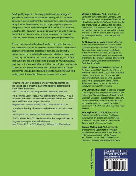 Developed by experts in trauma psychiatry and psychology and grounded in adolescent developmental theory, this is a modular, assessment-driven treatment that addresses the needs of adolescents facing trauma, bereavement, and accompanying developmental disruption. Created by the developers of the University of California, Los Angeles PTSD Reaction Index(c) and the Persistent Complex Bereavement Disorder Checklist, the book links clinicians with cutting-edge research in traumatic stress and bereavement, as well as ongoing training opportunities. This innovative guide offers teen-friendly coping skills, handouts, and specialized therapeutic exercises to reduce distress and promote adaptive developmental progression. Sessions can be flexibly tailored for group or individual treatment modalities; school-based, community mental health, or private practice settings; and different timeframes and specific client needs. Drawing on multidimensional grief theory, it offers a valuable toolkit for psychologists, psychiatrists, counsellors, and others who work with bereaved and traumatized adolescents. Engaging multicultural illustrations and extensive field-testing give this user-friendly manual international appeal.