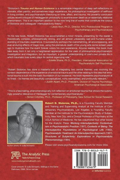 "Robert Stolorow has done a masterful job of integrating two central themes: one involving the context-dependence of the experience of emotional trauma and the other relating to the idea that emotional trauma is built into the basic foundation of our existence. It represents psychoanalysis at its finest - its themes are beautifully conceptualized, richly exemplified, and profoundly relevant." - Judith Alpert, President, Division of Trauma Psychology, American Psychological Association, USA