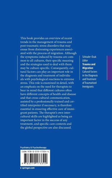 This book provides an overview of recent trends in the management of trauma and post-traumatic stress disorders that may ensue from distressing experiences associated with the process of migration. Although the symptoms induced by trauma are common to all cultures, their specific meaning and the strategies used to deal with them may be culture-specific. Consequently, cultural factors can play an important role in the diagnosis and treatment of individuals with psychological reactions to extreme stress. This role is examined in detail, with an emphasis on the need for therapists to bear in mind that different cultures often have different concepts of health and disease and that cross-cultural communication is therefore essential in ensuring effective care of the immigrant patient. The therapist's own intercultural skills are highlighted as being an important factor in the success of any treatment and specific care contexts and the global perspective are also discussed.
