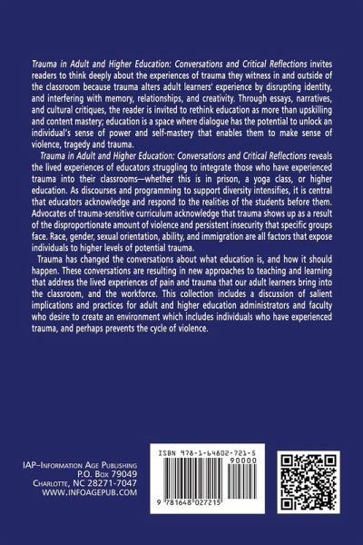 Trauma in Adult and Higher Education: Conversations and Critical Reflections invites readers to think deeply about the experiences of trauma they witness in and outside of the classroom, because trauma alters adult learners' experience by disrupting identity, and interfering with memory, relationships and creativity. Through essays, narratives, and cultural critiques, the reader is invited to rethink education as more than upskilling and content mastery; education is a space where dialogue has the potential to unlock an individual's sense of power and self-mastery that enables them to make sense of violence, tragedy and trauma. Trauma in Adult and Higher Education: Conversations and Critical Reflections reveals the lived experiences of educators struggling to integrate those who have experienced trauma into their classrooms - whether this is in prison, a yoga class, or higher education. As discourses and programming to support diversity intensifies, it is central that educators acknowledge and respond to the realities of the students before them. Advocates of trauma-sensitive curriculum acknowledge that trauma shows up as a result of the disproportionate amount of violence and persistent insecurity that specific groups face. Race, gender, sexual orientation, ability, and immigration are all factors that expose individuals to higher levels of potential trauma. Trauma has changed the conversations about what education is, and how it should happen. These conversations are resulting in new approaches to teaching and learning that address the lived experiences of pain and trauma that our adult learners bring into the classroom, and the workforce. This collection includes a discussion of salient implications and practices for adult and higher education administrators and faculty who desire to create an environment that includes individuals who have experienced trauma, and perhaps prevents the cycle of violence.