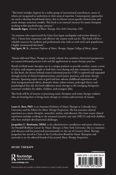 Board-certified music therapists are in a unique position to provide comfort, create a sense of safety, and empower people to find their voice during and after traumatic experiences. In this book, the theory behind trauma-informed practice (TIP) is explored and expanded through stories of clinical implementation, social justice practices, and music therapy theories. Spanning topics such as grief and loss, adverse childhood experiences and their intergenerational effects, domestic abuse, urban trauma, polyvagal theory, and psychological first aid, this book addresses music therapy as the emerging therapeutic treatment modality for adults, children, and teenagers alike.