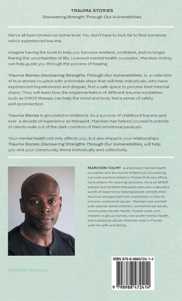 We've all been broken on some level. You don't have to look far to find someone who's experienced trauma. Imagine having the tools to help you become resilient, confident, and no longer fearing the uncertainties of life. Licensed mental health counselor, Marcken Volmy, can help guide you through the process of healing. Trauma Stories: Discovering Strength Through Our Vulnerabilities, is a collection of true stories coupled with actionable steps that will help individuals, who have experienced hopelessness and despair, find a safe space to process their internal chaos. They will learn how the implementation of different trauma modalities such as EMDR therapy can help the mind and body feel a sense of safety and reconnection. Trauma Stories is grounded in resilience. As a survivor of childhood trauma and over a decade of experience as therapist, Marcken has helped counsel hundreds of clients walk out of the dark corridors of their emotional paralysis. Your mental health not only affects you, but also impacts your relationships. Trauma Stories: Discovering Strength Through Our Vulnerabilities, will help you and your community thrive individually and collectively.