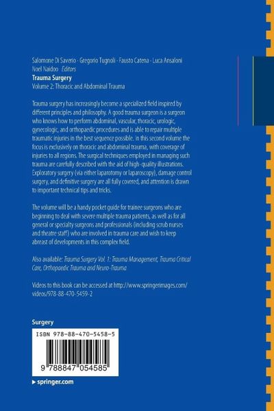 Trauma surgery has increasingly become a specialized field inspired by different principles and philosophy. A good trauma surgeon is a surgeon who knows how to perform abdominal, vascular, thoracic, urologic, gynecologic, and orthopaedic procedures and is able to repair multiple traumatic injuries in the best sequence possible. In this second volume the focus is exclusively on thoracic and abdominal trauma, with coverage of injuries to all regions. The surgical techniques employed in managing such trauma are carefully described with the aid of high-quality illustrations. Exploratory surgery (via either laparotomy or laparoscopy), damage control surgery, and definitive surgery are all fully covered, and attention is drawn to important technical tips and tricks.