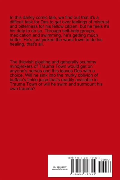 In this darkly comic tale, we find out that it's a difficult task for Des to get over feelings of mistrust and bitterness for his fellow citizen, but he feels it's his duty to do so. Through self-help groups, medication and swimming, he's getting much better. He's just picked the worst town to do his healing, that's all. The thievish gloating and generally scummy mindjerkers of Trauma Town would get on anyone's nerves and this leaves Des with a choice. Will he sink into the murky oblivion of buffalo's tinkle juice that's readily available in Trauma Town or will he swim and surmount his own trauma?