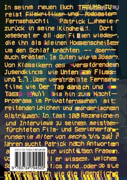 In seinem neuen Filmbuch Trauma-TV reist Filmkritiker und Podcaster Patrick Lohmeier zurück in seine Kindheit. Dort begegnet er all den Filmen wieder, die ihn als kleinen Hosenscheißer um den Schlaf brachten - aber auch prägten. Von Klassikern des verstörenden Jugendkinos wie Unten am Fluss (1978) und E.T. - Der Außerirdische (1982) über verstrahlte Fernsehfilme wie Der Tag danach (1983) und Threads (1984) bis hin zum Nachtprogramm im Privatfernsehen mit reitenden Leichen und mörderischen Alpträumen: In knapp hundert Rezensionen seiner meistgefürchteten Film- und Serienerfahrungen im Alter von sechs bis 13 Jahren sucht der Autor nach Antworten auf die wirklich wichtigen Fragen des Lebens. Filmkritikerin Sonja Hartl (Zeilenkino) und Psychologin Christiane Attig (Brainflicks) stehen ihm dabei mit all ihrer Kompentenz zur Seite. Vor allem will Patrick wissen, welche Schrecken zeitlos sind ... oder ob sie so vergänglich wie--- Aaargh!!!Pressestimmen zu Veröffentlichungen des Autors: "Nach der Lektüre dieses Standardwerks für die nächsten hundert Jahre sind einfach alle wesentlichen Fragen beantwortet." (epd Film über Columbo, Columbo) ___ "Für alle, die das Kino in all seinen Formen lieben." (Cinema über Bahnhofskino) ___ "Ein saftiges Stück Film- und Fernsehgeschichte." (CrimeMag über Columbo, Columbo) ___ "Beeindruckend." (Daniel Schröckert [Kino+] über den Audiokommentar zu Mandy [2018] ___ "Ein kleines Wunder." (nd.aktuell über Columbo, Columbo)