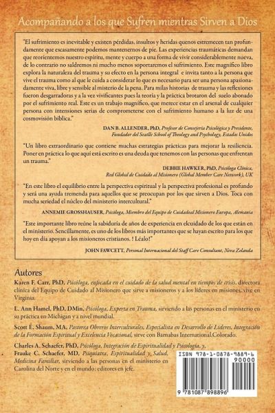 "El sufrimiento es inevitable y existen pérdidas, insultos y heridas quenos estremecen tan profundamente que escasamente podemos mantenernos de pie. Las experiencias traumáticas demandan que reorientemos nuestro espíritu, mente y cuerpo a una forma de vivir considerablemente nueva, de lo contrario no saldremos ni mucho menos soportaremos el sufrimiento. Este magnífico libro explora la naturaleza del trauma y su efecto en la persona integral e invita tanto a la persona que vive el trauma como al que le cuida a considerar lo que es necesario para ser una persona apasionadamente viva, libre y sensible al misterio de la pena. Para mílas historias de trauma y las reflexiones fueron desgarradoras y a la vez vivificantes pues la teoría y la práctica brotaron del suelo abonado por el sufrimiento real. Este es un trabajo magnífico, que merece estar en el arsenal de cualquier persona con intensiones serias de comprometerse con el sufrimiento humano a la luz de una cosmovisión bíblica." DAN B. ALLENDER, PhD, Profesor de Consejería Psicológica y Presidente, Fundador del Seatlle School of Theology and Psychology, Estados Unidos "Un libro extraordinario que contiene muchas estrategias prácticas para mejorar la resiliencia. Poner en práctica lo que aquí está escrito es una deuda que tenemos con las personas que enfrentan un trauma." DEBBIE HAWKER, PhD, Psicóloga Clínica, Red Global de Cuidado al Misionero (Global Member Care Network), UK "En este libro el equilibrio entre la perspectiva espiritual y la perspectiva profesional es profundo y será una ayuda tremenda para aquellos que se preocupan por los que sirven a Dios. Toca con mucha seriedad el núcleo del ministerio intercultural." ANNEMIE GROSSHAUSER, Psicóloga, Miembro del Equipo de Cuidadoal Misionero Europa, Alemania "Este importante libro reúne la sabiduría de años de experiencia en elcuidado de los que están en el ministerio. Sencillamente, es uno de los libros más importantes que se hayan escrito para los que hoy en día apoyan a los misioneros cristianos. ! Léalo!" JOHN FAWCETT, Personal Internacional del Staff Care Consultant, Neva Zelanda