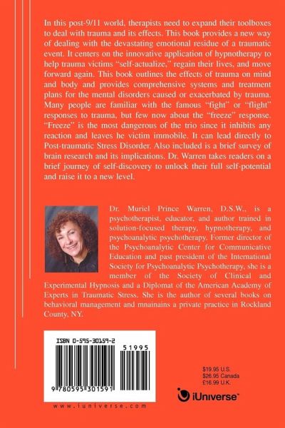 In this post-9/11 world, therapists need to expand their toolboxes to deal with trauma and its effects. This book provides a new way of dealing with the devastating emotional residue of a traumatic event. It centers on the innovative application of hypnotherapy to help trauma victims "self-actualize," regain their lives, and move forward again. This book outlines the effects of trauma on mind and body and provides comprehensive systems and treatment plans for the mental disorders caused or exacerbated by trauma. Many people are familiar with the famous "fight" or "flight" responses to trauma, but few now about the "freeze" response. "Freeze" is the most dangerous of the trio since it inhibits any reaction and leaves he victim immobile. It can lead directly to Post-traumatic Stress Disorder. Also included is a brief survey of brain research and its implications. Dr. Warren takes readers on a brief journey of self-discovery to unlock their full self-potential and raise it to a new level.