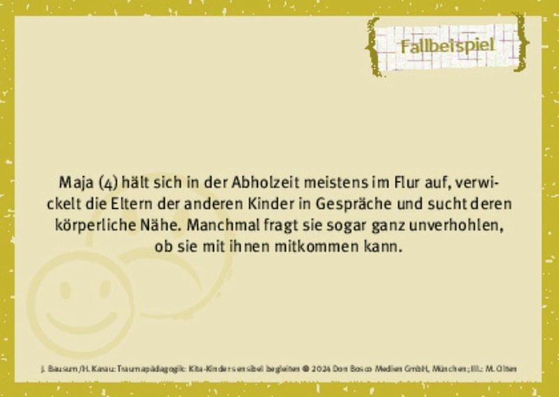 Einführung und Basiswissen: Was versteht man unter einem traumatischen Ereignis? Was brauchen traumatisierte Kinder?Medienpaket für Ausbildung, Weiterbildung und Teamarbeit, Thementage und TeambesprechungenBuch mit 60 Bildkarten in einer Stülpschachtel sowie Downloadcode für ZusatzmaterialTraumapädagogik-Methoden im Porträt: Wie Sie betroffene Kinder unterstützenHilfe durch Selbstfürsorge: Reflexionsfragen für Erzieher:innen, um Belastungen zu verarbeiten