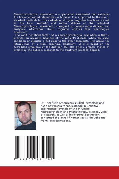 Neuropsychological assessment is a specialized assessment that examines the brain-behavioral relationship in humans. It is supported by the use of standard methods for the evaluation of higher cognitive functions, as well as the basic aesthetic and motor abilities of the individual. Neuropsychological assessment is designed to provide more detailed and analytical information about cognitive abilities than neurological assessment. The most beneficial factor of a neuropsychological evaluation is that it provides an accurate diagnosis of the patient's disorder when the exact condition or disorder is not clear to the other therapists. This allows the introduction of a more expensive treatment, as it is based on the accredited symptoms of the disorder. This also gives a greater chance of predicting the patient's response to the treatment protocol applied.