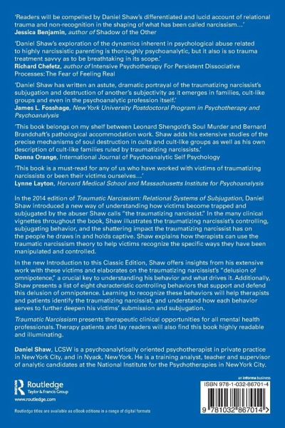 "This book is a must-read for any of us who have worked with victims of traumatizing narcissists or been their victims ourselves. Whether drawing on his personal experience in the clinic and in cults, or analyzing literary productions and the inner worlds of their creators, Dan Shaw brings vividly to life the relational world of those bent on subjugating others -- and of those who have been subjugated by them. Not since Benjamin's The Bonds of Love has there been such a powerful analysis of the psychic life of domination and submission, complemented by a moving account of the effect of analytic love. Perhaps only someone like Shaw, who has known firsthand the psychic effects and needs fulfilled by living in a world of traumatizing narcissists, could have provided such a compassionate and helpful guide for clinicians engaged in the painful work of helping those who have been drawn into the traumatizing narcissist's relational system." - Lynne Layton, Harvard Medical School and Massachusetts Institute for Psychoanalysis