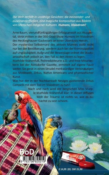 Die Welt zerfällt in unzählige Gesichter, die ineinander- und auseinanderfließen, eine magische Komposition aus Bildern von Menschen indigener Kulturen. Humans, Visiodrom! Arne Baum, vierundfünfzigjähriger Erfolgsanwalt aus Wuppertal, stirbt mitten in der 360-Grad-Show Humans im Visiodrom des Heckinghauser Gaskessels an einer Überdosis Heroin.Der mysteriöse Selbstmord des aktiven Mannes stößt nicht nur bei der Bevölkerung, sondern auch bei der Kriminalpolizei auf Ungläubigkeit. Aufgrund der Beweislage ordnet die Staatsanwaltschaft jedoch an, den Fall zu den Akten zu legen.Mathilde Krähenfuß, Politredakteurin a.D. und freie Mitarbeiterin bei der Ronsdorfer Gazette, ermittelt auf eigene Faust weiter. Sie gerät in einen Strudel merkwürdiger Verbindungen aus Modewelt, Zirkus, Native Americans und phantastischer Kunst.Was hat der in der Nachbarstadt Neviges gastierende Zirkus Campelli mit dem Tod im Visiodrom zu tun?Nach und nach wird der bergischen Miss Marple Mathilde Krähenfuß klar: In dieser diffusen Welt der Träume ist nichts so, wie es zunächst zu sein scheint.