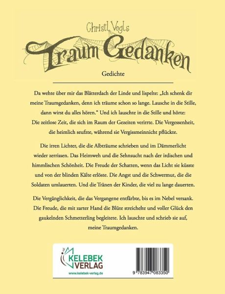 Da wehte über mir das Blätterdach der Linde und lispelte: - Ich schenk dir meine Traumgedanken, denn ich träume schon so lange. Lausche in die Stille, dann wirst du alles hören.- Und ich lauschte in die Stille und hörte: Die zeitlose Zeit, die sich im Raum der Gezeiten verirrte. Die Vergessenheit, die heimlich seufzte, während sie Vergissmeinnicht pflückte. Die irren Lichter, die die Albträume schrieben und im Dämmerlicht wieder zerrissen. Das Heimweh und die Sehnsucht nach der irdischen und himmlischen Schönheit. Die Freude der Schatten, wenn das Licht sie küsste und von der blinden Kälte erlöste. Die Angst und die Schwermut, die die Soldaten umlauerten. Und die Tränen der Kinder, die viel zu lange dauerten. Die Vergänglichkeit, die das Vergangene entfärbte, bis es im Nebel versank. Die Freude, die mit zarter Hand die Blüte streichelte und voller Glück den gaukelnden Schmetterling begleitete. Ich lauschte und schrieb sie auf, meine Traumgedanken.