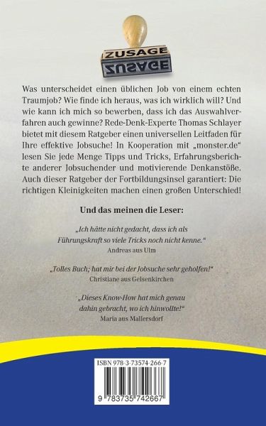 Was unterscheidet einen üblichen Job von einem echten Traumjob? Wie finde ich heraus, was ich wirklich will? Und wie kann ich mich so bewerben, dass ich das Auswahlverfahren auch gewinne? Rede-Denk-Experte Thomas Schlayer bietet mit diesem Ratgeber einen universellen Leitfaden für Ihre effektive Jobsuche! In Kooperation mit "monster.de" lesen Sie jede Menge Tipps und Tricks, Erfahrungsberichte anderer Jobsuchender und motivierende Denkanstöße.Auch dieser Ratgeber der Fortbildungsinsel garantiert: Die richtigen Kleinigkeiten machen einen großen Unterschied! Und das meinen die Leser:"Ich hätte nicht gedacht, dass ich als Führungskraft so viele Tricks noch nicht kenne." (Andreas aus Ulm)"Tolles Buch; hat mir bei der Jobsuche sehr geholfen!" (Christiane aus Gelsenkirchen)"Dieses Know-How hat mich genau dahin gebracht, wo ich hinwollte!" (Maria aus Mallersdorf)Und das sagt das Team von monster.de:Thomas Schlayer war viele Jahre lang ein gern gebuchter Experte für unsere Foren rund um das Thema Bewerben. Unser monster.de-Portal erreicht pro Jahr viele Millionen Menschen, die sich beruflich verändern möchten. Daher können wir mit sehr gutem Gewissen die Kleinigkeiten-Philosophie von Thomas Schlayer und seinem Team empfehlen...