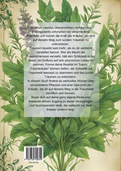 In dieser zweiten, überarbeiteten Version des ersten Buches, greifen wir unterschiedliche Praktiken auf und machen uns die Kraft der Kräuter zu Nutzen, so dass sie dich auf deinem Weg zum luziden Träumer_in unterstützen können. Träumen bewirkt so viel mehr, als du aktuell vielleicht erahnen magst. Wer verstanden hat wie viel Macht in der Traumdimension zu finden ist, hat den Schlüssel in der Hand Einfluss auf sein physisches Leben zu nehmen. Forme deine Realität im Traum. Traumkräuter können helfen, die Schwelle in die Traumwelt bewusst zu übertreten und luzides Träumen zu erleichtern. In diesem Buch findest du viel Wissenswertes zu den verschiedenen Gewächsen und eine Übersicht der Kräuter, die dir auf deinem Weg in die Traumwelt behilflich sein können.Begib dich auf deine ganz eigene Reise und finde deinen Zugang zu dieser einzigartigen und spannenden Welt, die vielleicht nur zwei Kräuter von dir entfernt liegt.